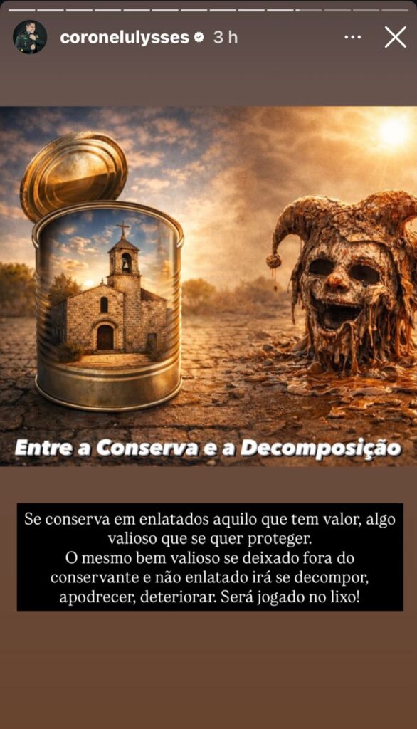 Em outra publicação, Ulysses ampliou a comparação ao explicar o simbolismo. “Se conserva em enlatados aquilo que tem valor, algo valioso que se quer proteger. O mesmo bem valioso se deixado fora do conservante e não enlatado irá se decompor, apodrecer, deteriorar. Será jogado no lixo!”, afirmou.