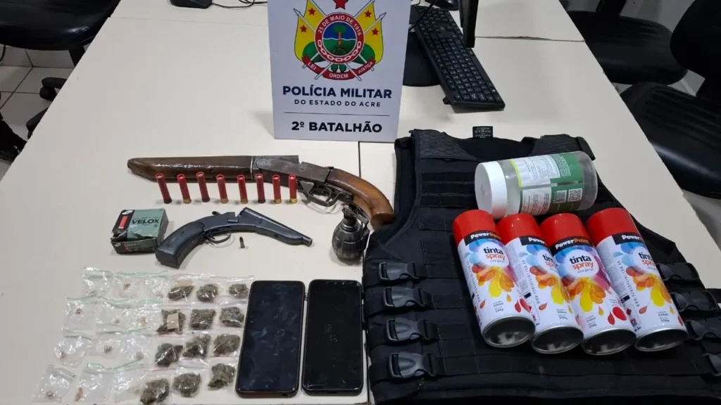 Ação da Força Tática no Segundo Distrito de Rio Branco apreende armas, munições, drogas e até uma granada. Dois