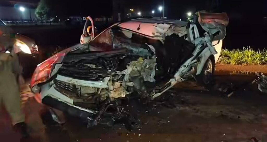 Caminhonete ficou completamente destruída após colisão frontal com carreta; vítima está internada em estado grave O empresário cruzeirense Jansen