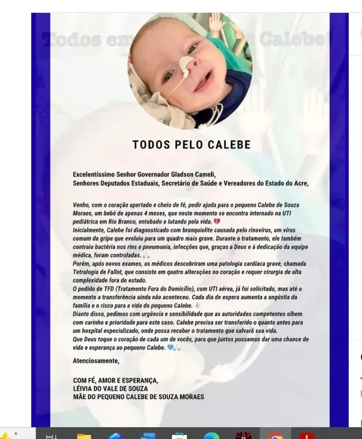 Um bebê de apenas quatro meses, identificado como Calebe de Souza, foi transferido na madrugada desta quinta-feira (30) do Hospital da Criança, em Rio Branco, para o Hospital da Criança e Maternidade de São José do Rio Preto, em São Paulo. Natural de Plácido de Castro, o menino foi diagnosticado com uma cardiopatia grave e necessitava de tratamento especializado em unidade de referência nacional.