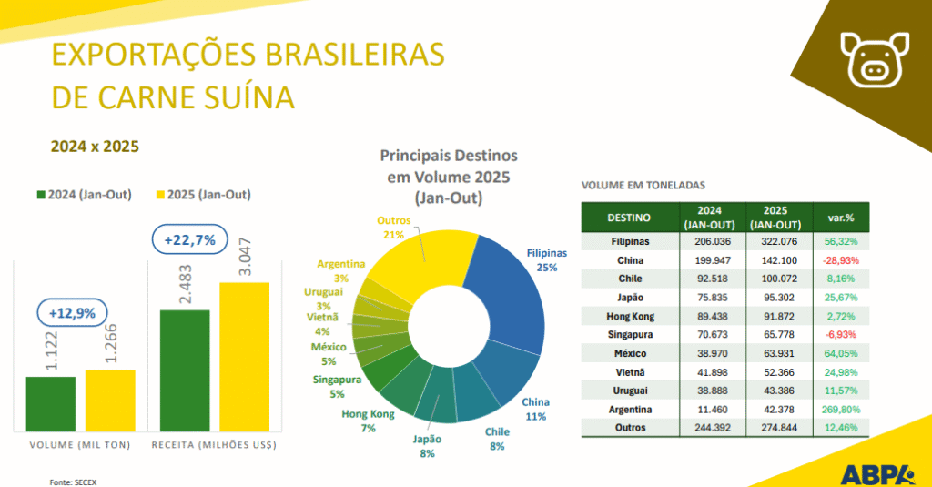 De janeiro a outubro deste ano, as exportações de carne suína acumularam alta de 12,9% em volume e 22% em receita, de acordo com o presidente da ABPA, Ricardo Santin. Filipinas, China e Chile foram os principais destinos.