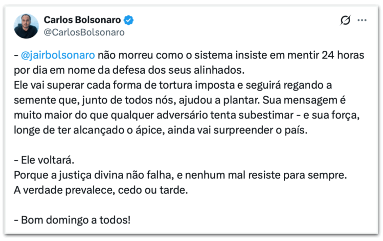 Segundo o vereador, Bolsonaro segue firme apesar das restrições impostas pela prisão preventiva, decretada em 22 de novembro. Ele está detido na Superintendência da Polícia Federal, em Brasília, após cumprir prisão domiciliar desde 4 de agosto. Para Carlos, o pai continuará “regando a semente” que ajudou a plantar e resistindo ao que classifica como ataques do sistema.