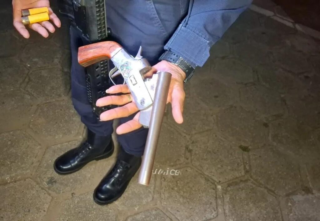 Durante a abordagem, a equipe localizou uma escopeta calibre 20 com duas munições intactas em cima de uma mesa. Após identificar o responsável pela arma, os policiais constataram que se tratava de Gustavo, que utiliza tornozeleira eletrônica e possui um histórico criminal significativo.