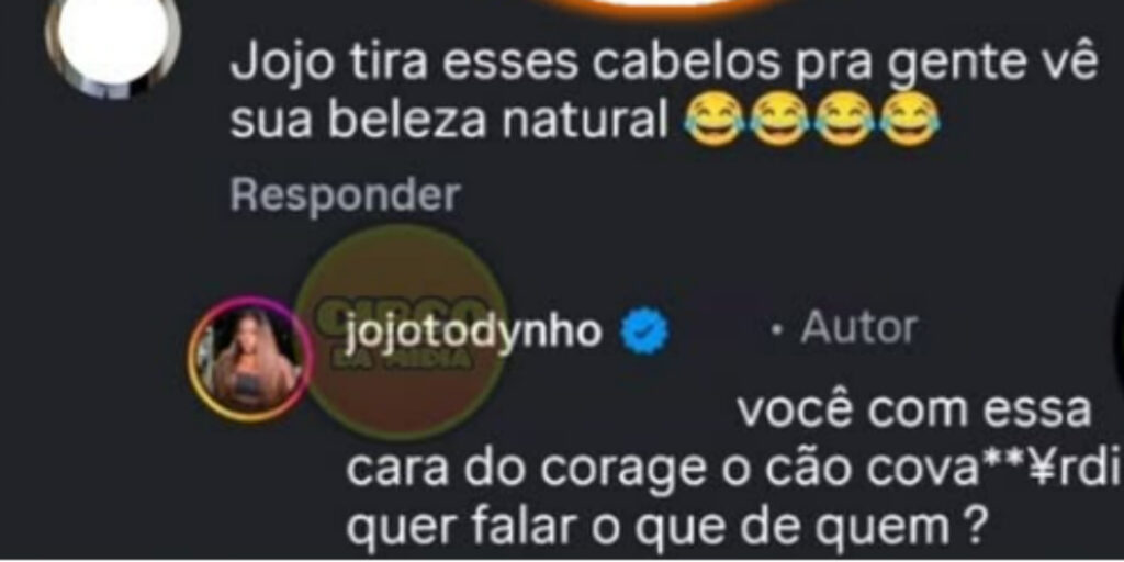 Sem deixar a provocação passar em branco, Jojo respondeu de forma direta e debochada. “Você com essa cara de Coragem, o Cão Covarde quer falar o que de quem?”, rebateu a cantora, arrancando risadas e aplausos virtuais de seguidores.