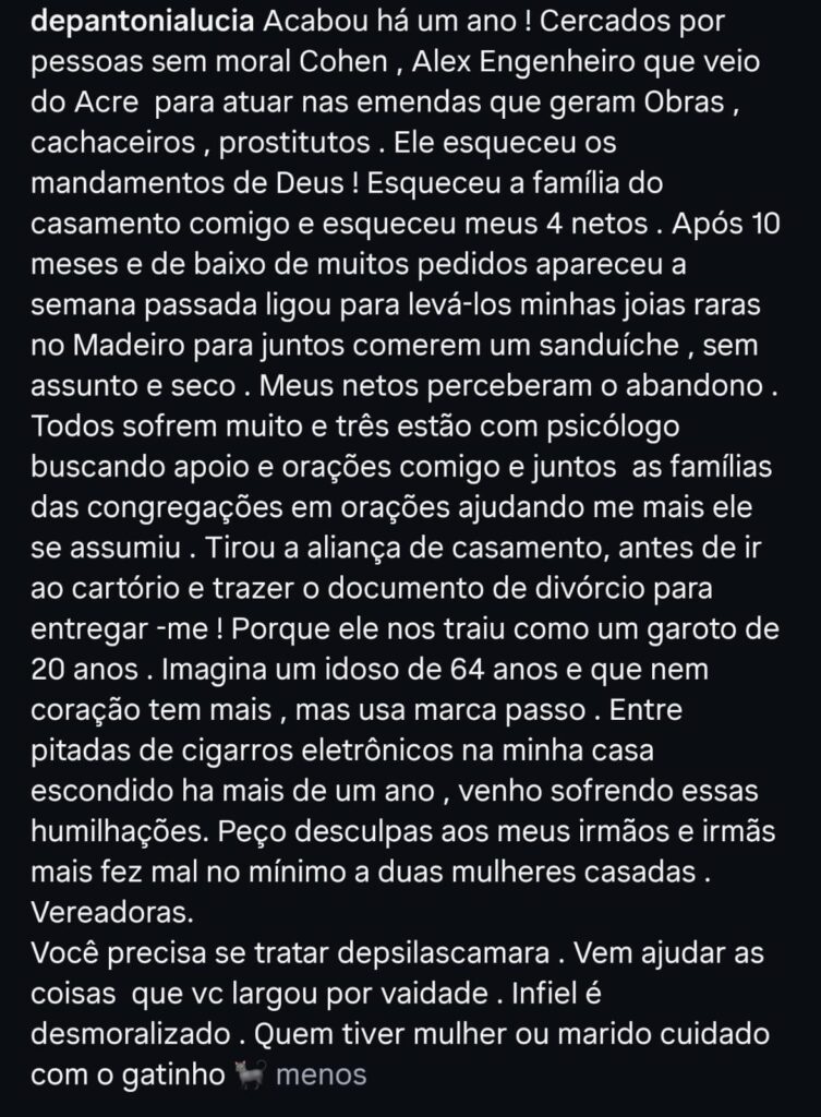 Antônia Lúcia relata que Silas teria se afastado não apenas do casamento, mas também dos netos, passando dez meses sem contato com eles. A deputada afirma que três dos quatro netos estão em acompanhamento psicológico por conta da situação. No texto, ela diz que o marido teria “esquecido os mandamentos de Deus” e deixado de lado os compromissos familiares, o que teria ampliado o desgaste dentro de casa.