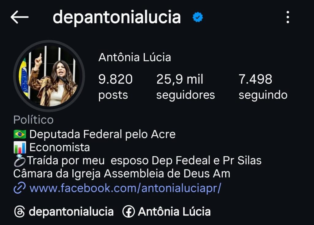 A deputada federal Antônia Lúcia (Republicanos-AC) voltou às redes sociais nesta terça-feira, 2, para expor a crise conjugal com o também deputado federal Silas Câmara (Republicanos-AM). No desabafo, ela afirma que o marido, de 64 anos, teria traído e abandonado a família, agindo “como um garoto de 20 anos”. Segundo ela, o parlamentar teria inclusive retirado a aliança e tomado providências para oficializar o divórcio.