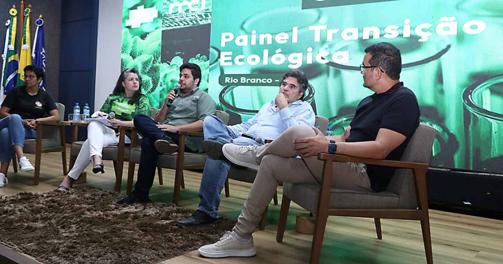 O painel “Desafios e oportunidades da transição ecológica no Acre” foi mediado por Juliana Borges e reuniu Carlos Ouvídio Duarte, assessor de Planejamento Estratégico da Dom Porquito; Lucas Modesto Cruz, engenheiro civil da indústria Acre Aves; André Siza, diretor comercial da Roda Viva Transportes e Logísticas; e Izanelda Batista de Magalhães, fundadora e CEO da Nãnê Indústria de Sorvetes.