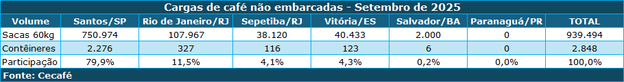 A entrada da nova safra de café no mercado escancarou os entraves logísticos nos portos brasileiros, segundo o Conselho dos Exportadores de Café do Brasil (Cecafé). Em setembro, 939 mil sacas do produto — o equivalente a 2.848 contêineres — ficaram retidas sem embarque. O prejuízo com armazenagem, pré-stacking e detentions chegou a R$ 8,99 milhões, o terceiro maior já registrado pela entidade, atrás apenas dos de novembro e dezembro de 2024.