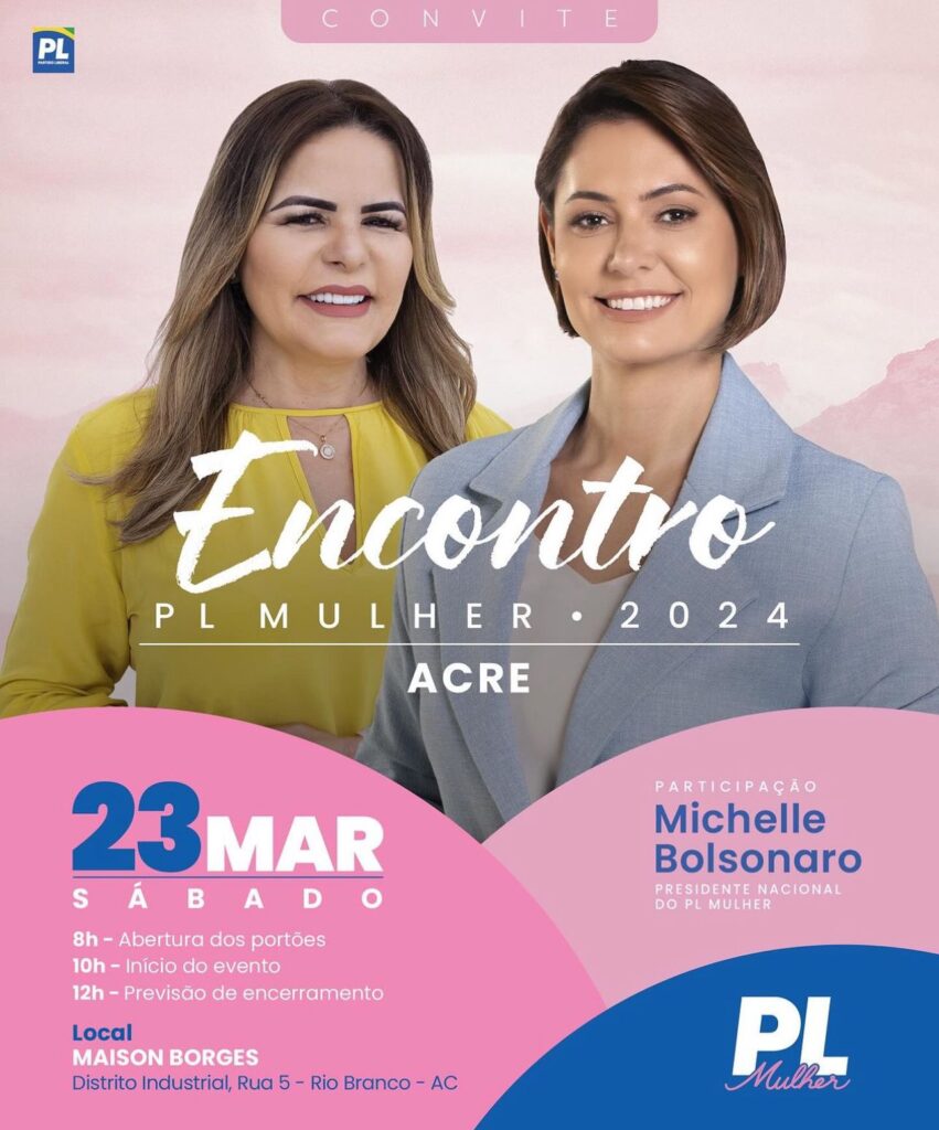 O Encontro do PL Mulher no Acre, busca incentivar e engajar a participação das mulheres na política, e contará com a participação da Presidente Nacional, Michelle Bolsonaro, e da Presidente Estadual, Charlene Lima.