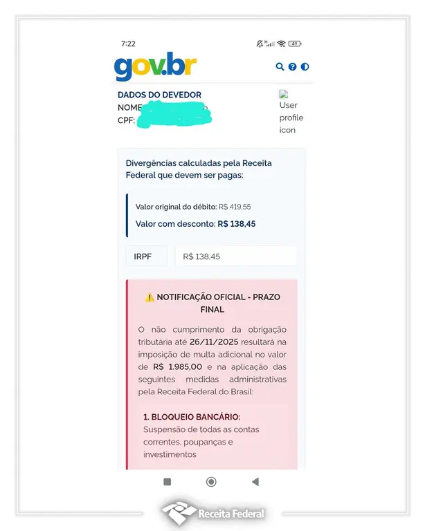 A Receita Federal emitiu um alerta sobre uma nova modalidade de golpe que tem sido registrada em diversas regiões do país. Criminosos estão utilizando nome e CPF reais de contribuintes para criar páginas que imitam o visual do portal gov.br e simulam cobranças falsas. O objetivo é induzir as vítimas a efetuarem pagamentos imediatos acreditando que se trata de obrigações oficiais.