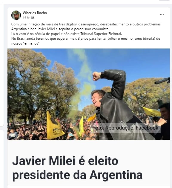 “Com uma inflação de mais de três dígitos, desemprego, desabastecimento e outros problemas, Argentina elege Javier Milei e sepulta o peronismo comunista. Lá o voto é na cédula de papel e não existe Tribunal Superior Eleitoral. No Brasil ainda teremos que esperar mais 3 anos para tentar trilhar o mesmo rumo (direita) de nossos ermanos”, escreveu Rocha no Facebook.