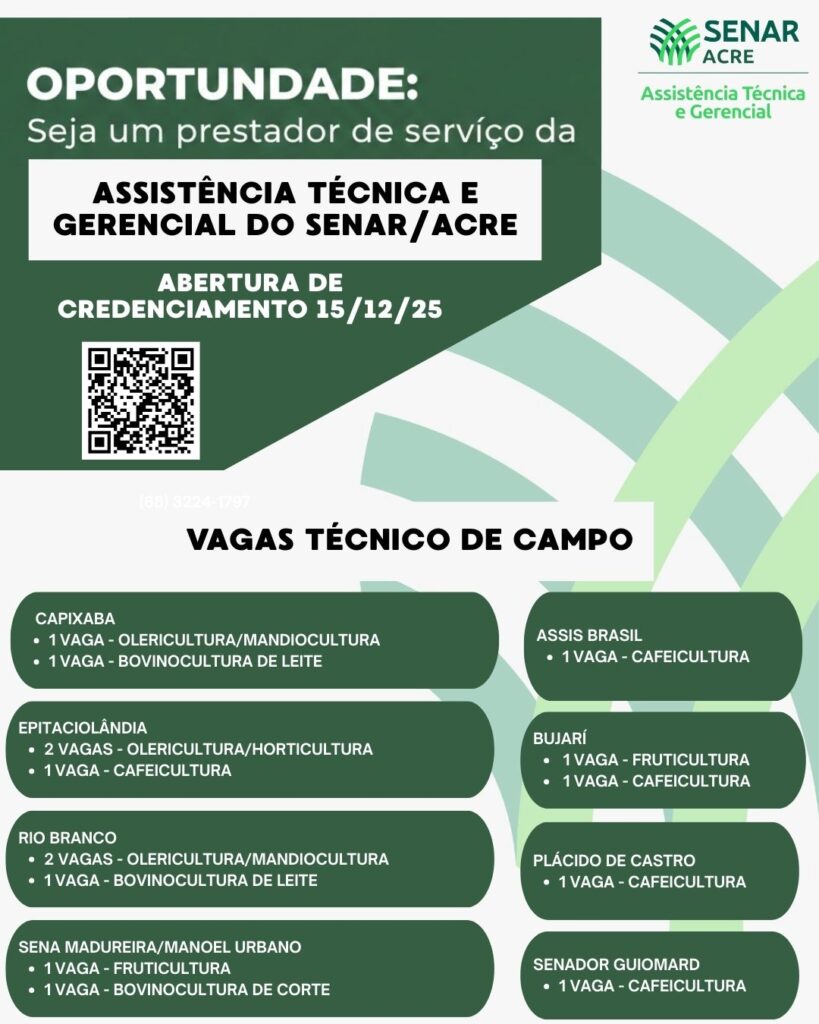 O Serviço Nacional de Aprendizagem Rural (SENAR – AC) anunciou a abertura do credenciamento para profissionais interessados em atuar na Assistência Técnica e Gerencial (ATeG) em diversas cadeias produtivas no estado. O processo começará no dia 15 de dezembro de 2025 e seguirá até 15 de janeiro de 2026, contemplando vagas para Técnico de Campo em múltiplos municípios do Acre.