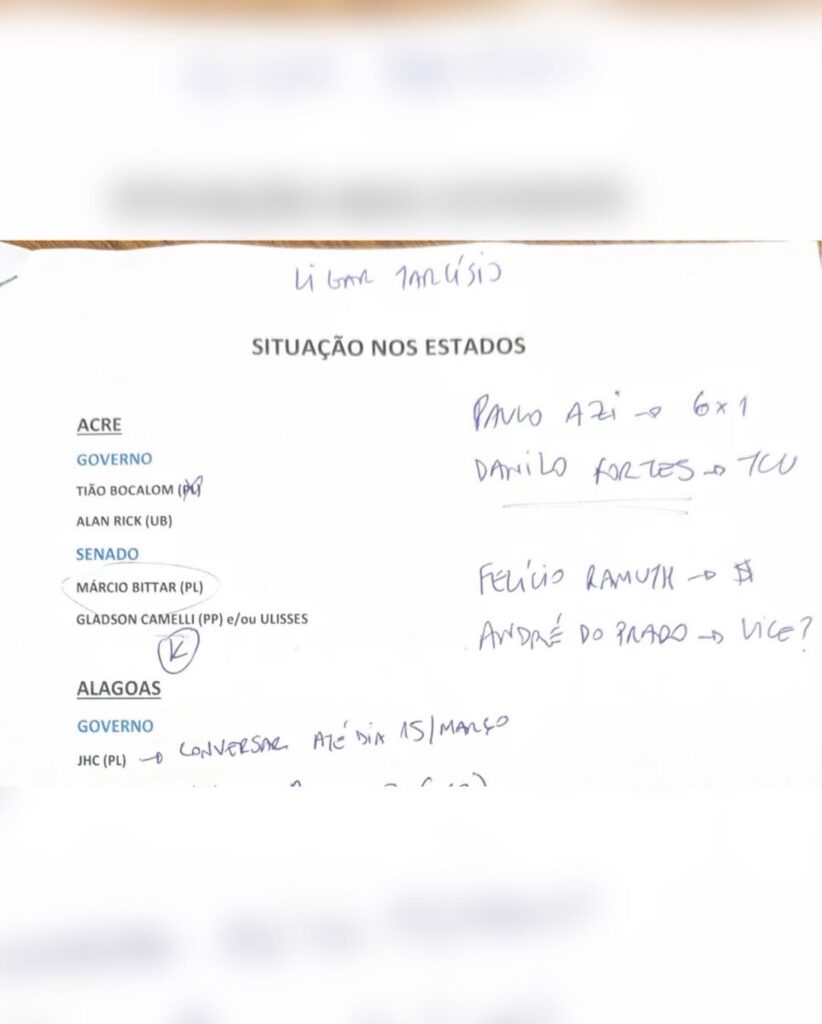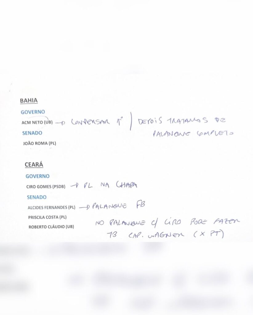 O documento também traz exemplos de estratégias em outros estados, como no Rio de Janeiro, onde o PL abriu espaço para aliados do Centrão na disputa ao Senado, e em São Paulo, maior colégio eleitoral do país, onde há menções a conversas com o governador Tarcísio de Freitas e à possibilidade de composição de chapa.